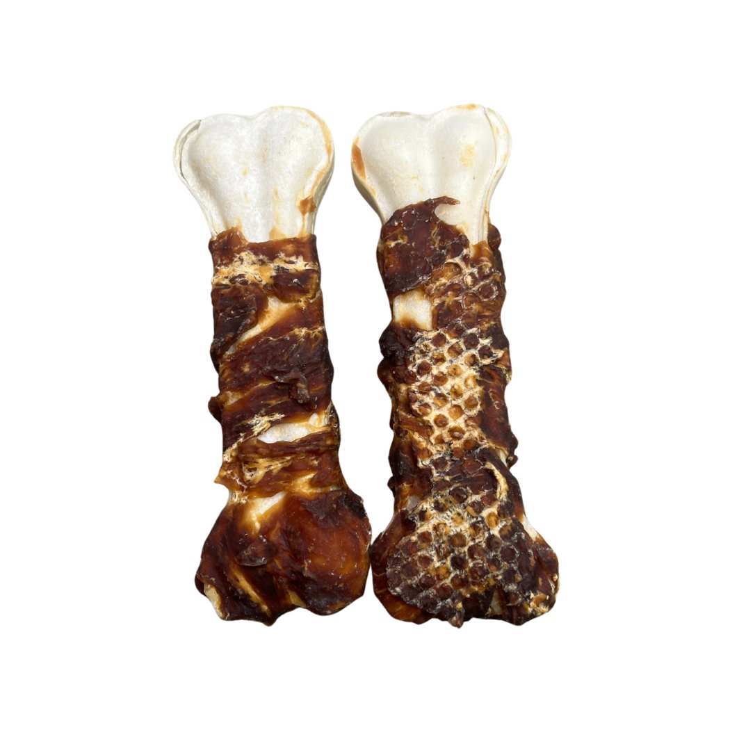 Samenstelling: onderhuids bindweefsel van runderhuid (verbinding tussen huid en dier), omwikkeld met eendfilet